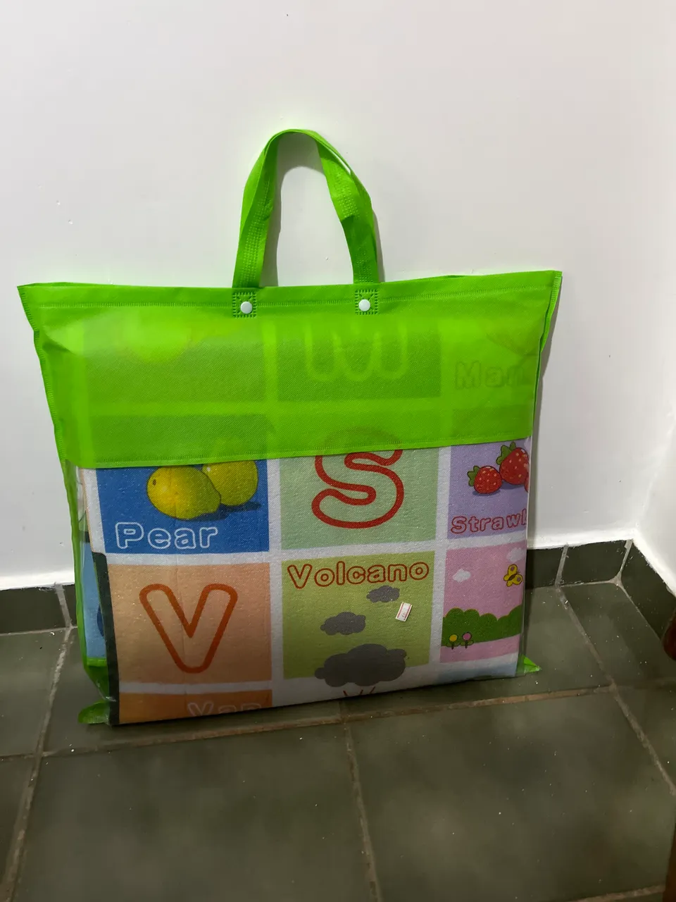 Tapete de atividades educativo com letras e desenhos coloridos para estimular a criatividade e aprendizado das crianças. Ideal para brincar e aprender!