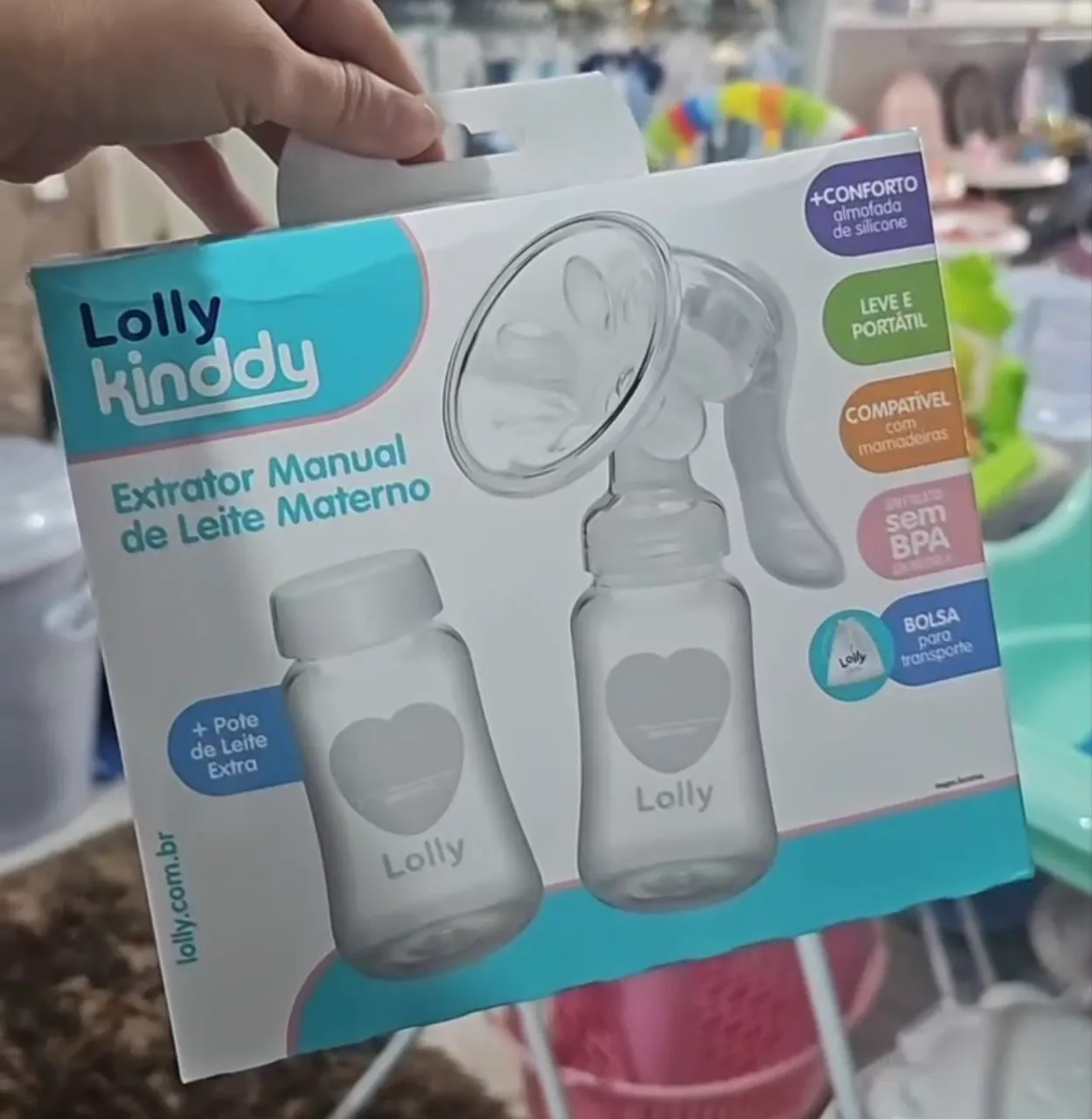 Facilite a amamentação com o Extrator Manual de Leite Materno Lolly Kinddy! Com almofada de silicone para maior conforto, leve e portátil, compatível com mamadeiras e livre de BPA. Acompanha um pote extra e bolsa para transporte, tornando o processo prático e seguro.