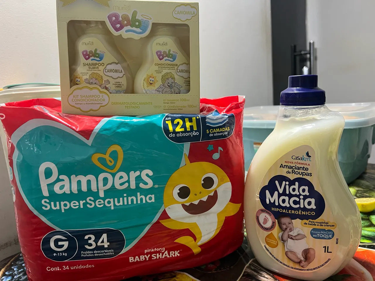 Kit completo para o seu bebê! Inclui fraldas Pampers Super Sequinha tamanho G, shampoo e condicionador Muriel Baby Camomila, e amaciante de roupas Vida Macia hipoalergênico. Tudo para o cuidado e conforto do seu pequeno!