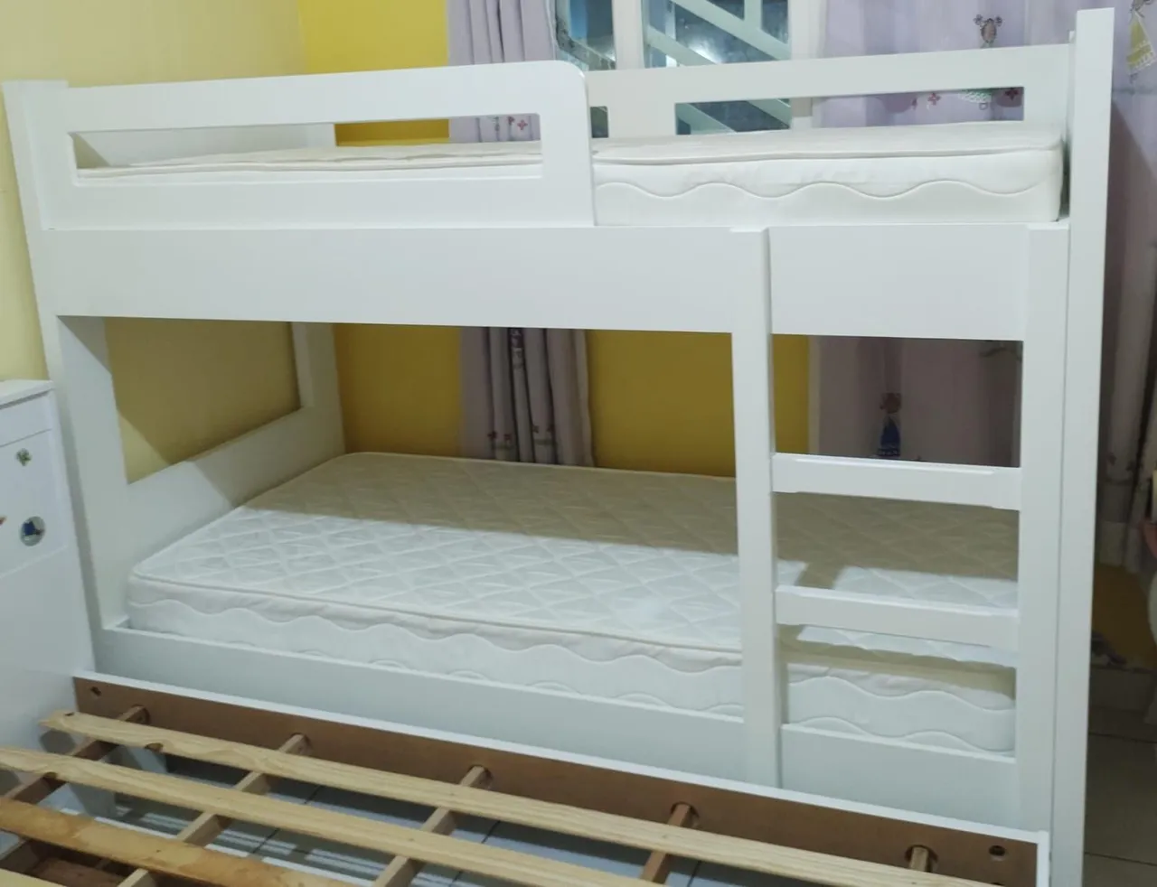 Beliche em MDF branco, ideal para otimizar o espaço do quarto infantil. Design moderno e seguro para as crianças. Bem conservada e bem reforçada. Não acompanha os colchões.