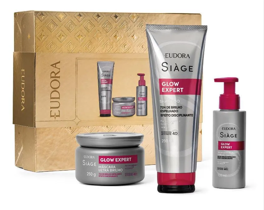 Transforme seus cabelos com o Kit Presente Siàge Glow Expert! Este kit completo oferece shampoo, máscara ultra brilho e sérum disciplinante para um cabelo com brilho espelhado e efeito disciplinante por até 72 horas. Experimente a tecnologia Affinité 4D e conquiste um visual deslumbrante!