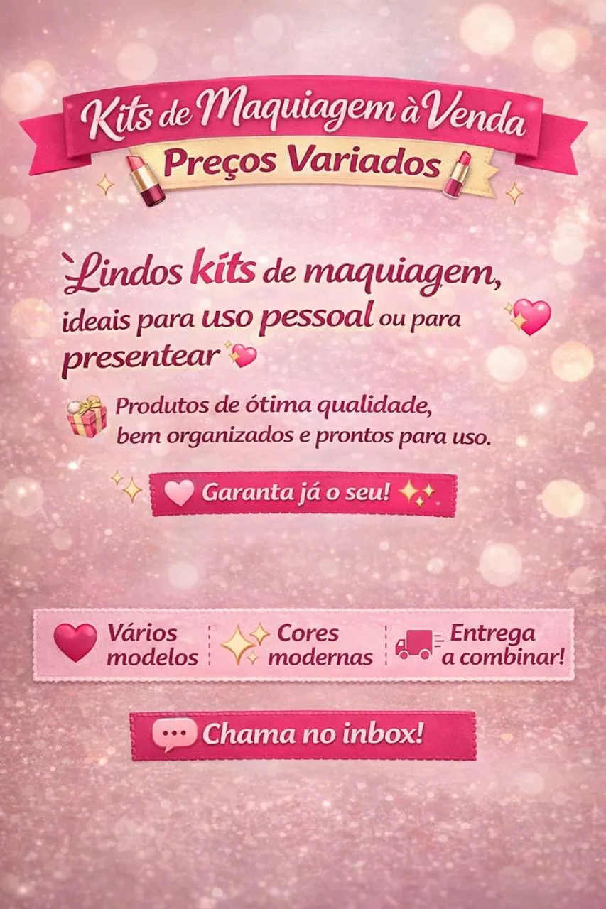 Kits de maquiagem incríveis com preços variados! Lindos kits com cores modernas e modelos diversos, perfeitos para uso pessoal ou presentear. Produtos de ótima qualidade, prontos para realçar sua beleza. Entre em contato e garanta já o seu!