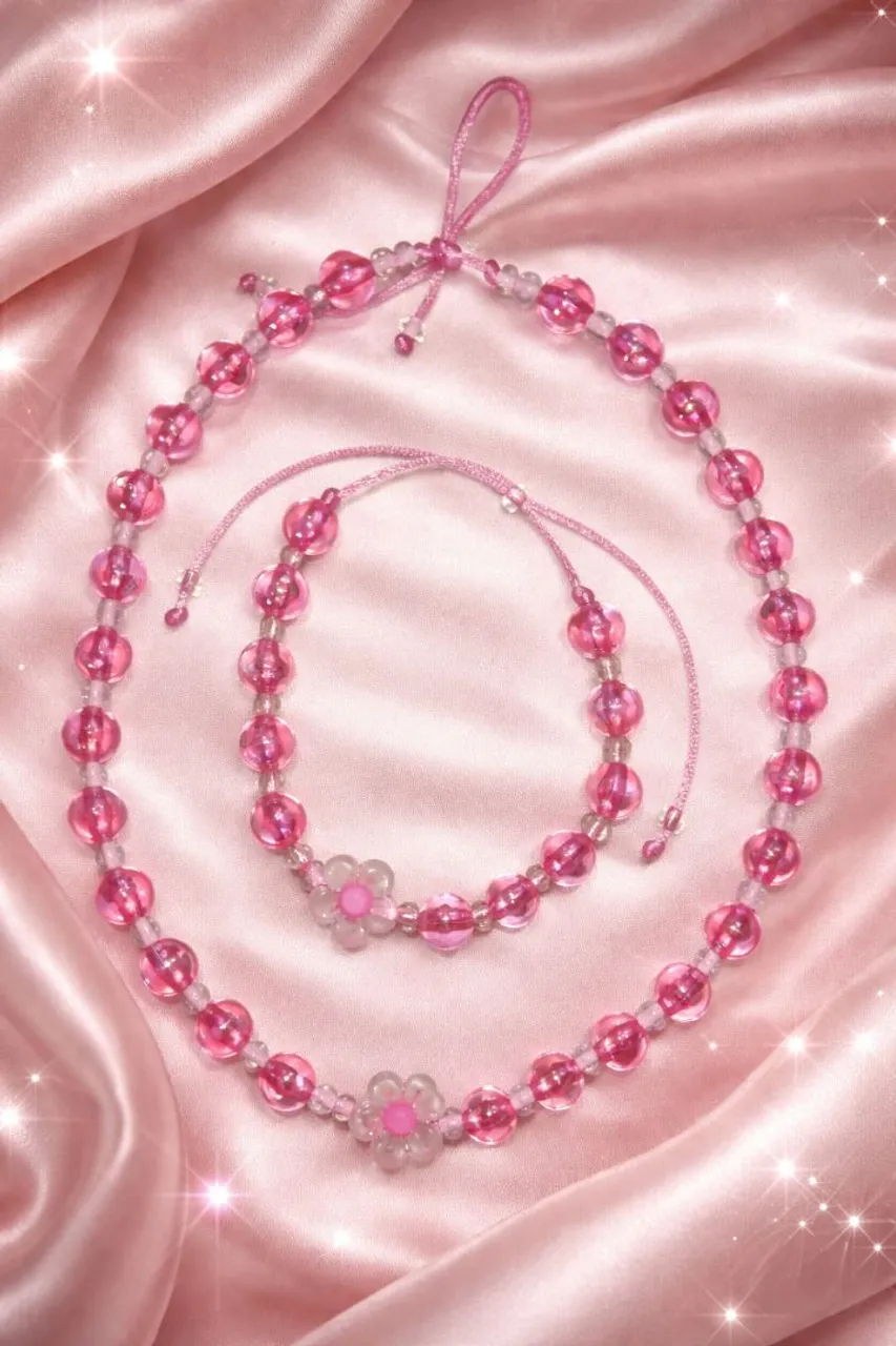 Lindo conjunto de pulseira e colar rosa com detalhes de flores. Perfeito para complementar seu look com um toque de delicadeza e charme!