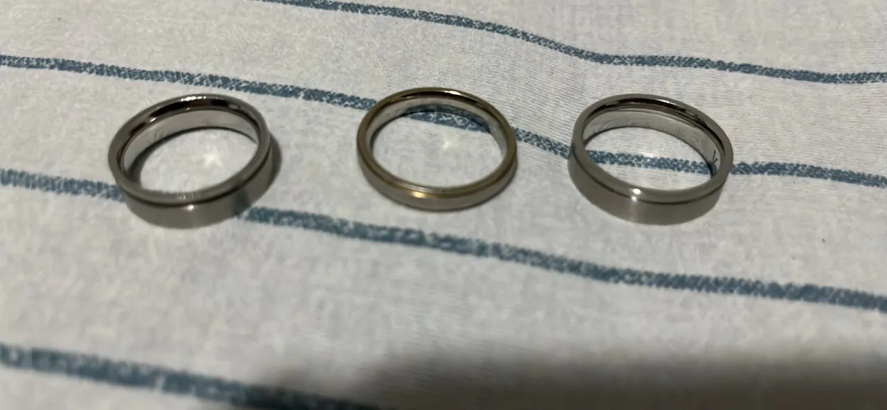 Par de alianças/anéis em aço inox, cor prata, com design moderno.