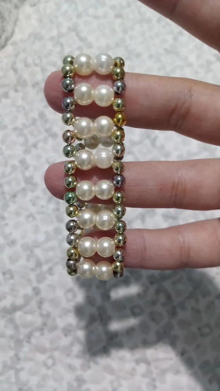 Linda pulseira com pérolas e detalhes em diferentes tons de metal. Um acessório elegante e charmoso para complementar seu visual.