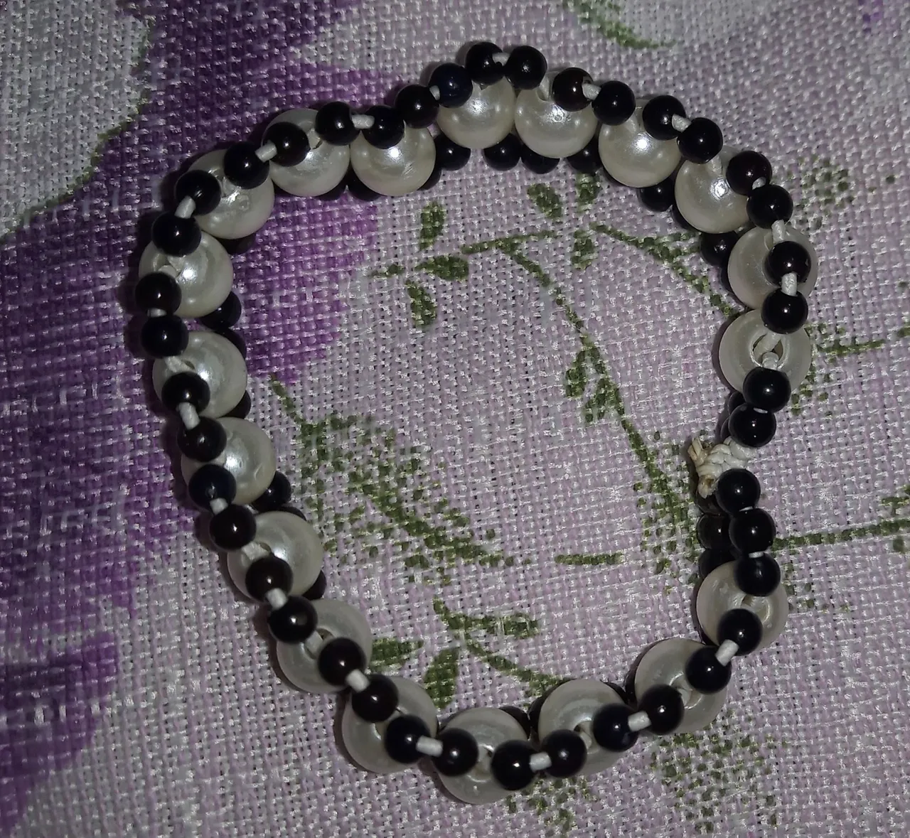 Linda pulseira com pérolas e detalhes em contas pretas, um acessório elegante e versátil para complementar seu visual.