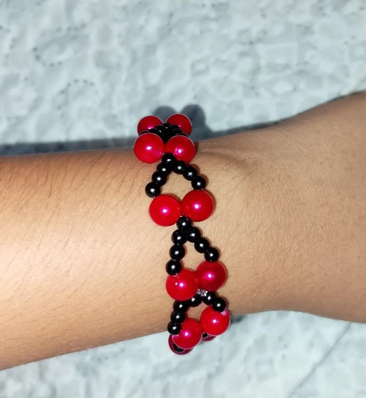 Linda pulseira artesanal com miçangas vermelhas e pretas, perfeita para complementar seu visual com estilo e personalidade.