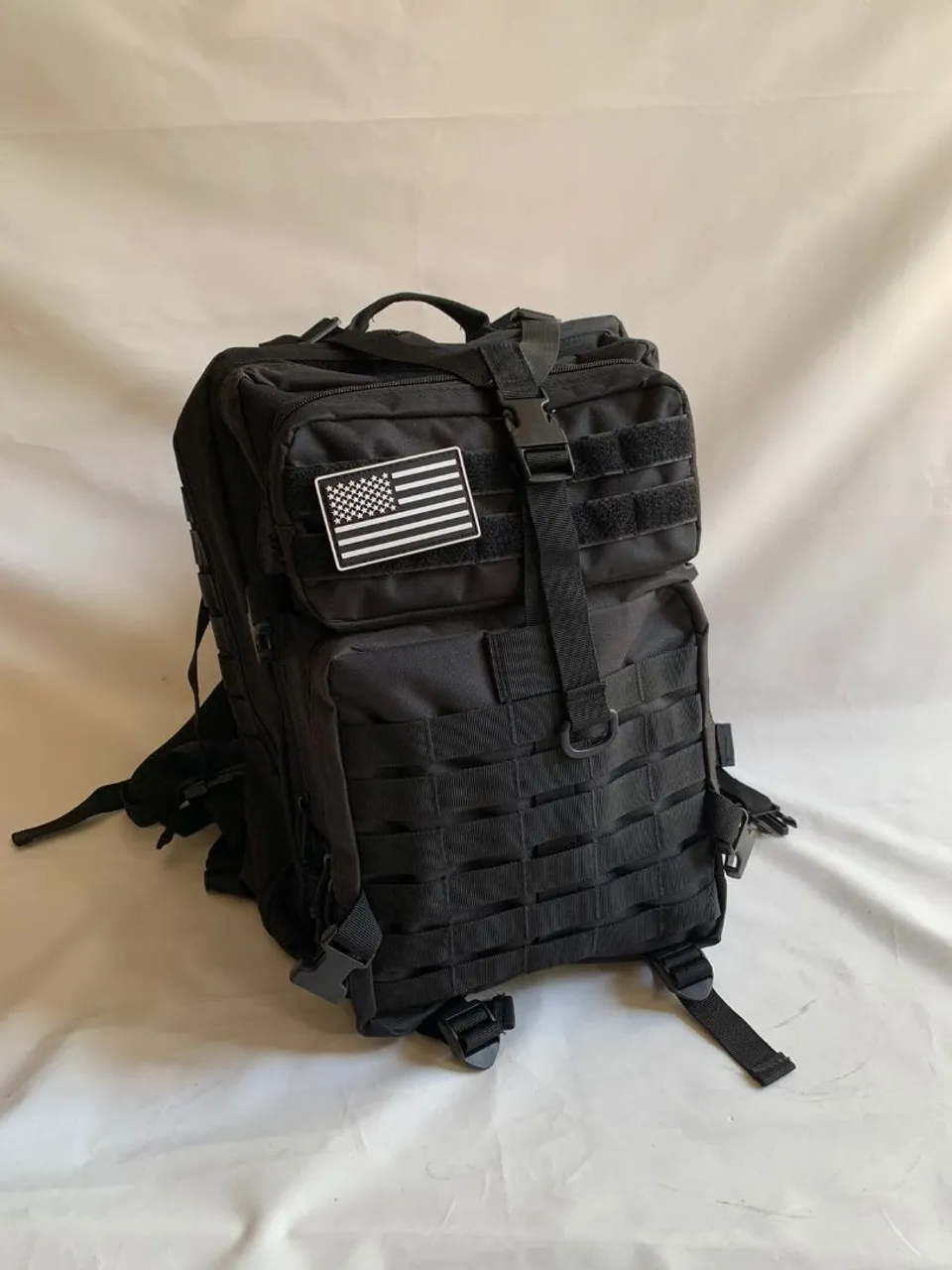 Mochila tática militar preta com diversos compartimentos, ideal para atividades outdoor e uso diário. Design resistente e funcional com patch da bandeira dos EUA.