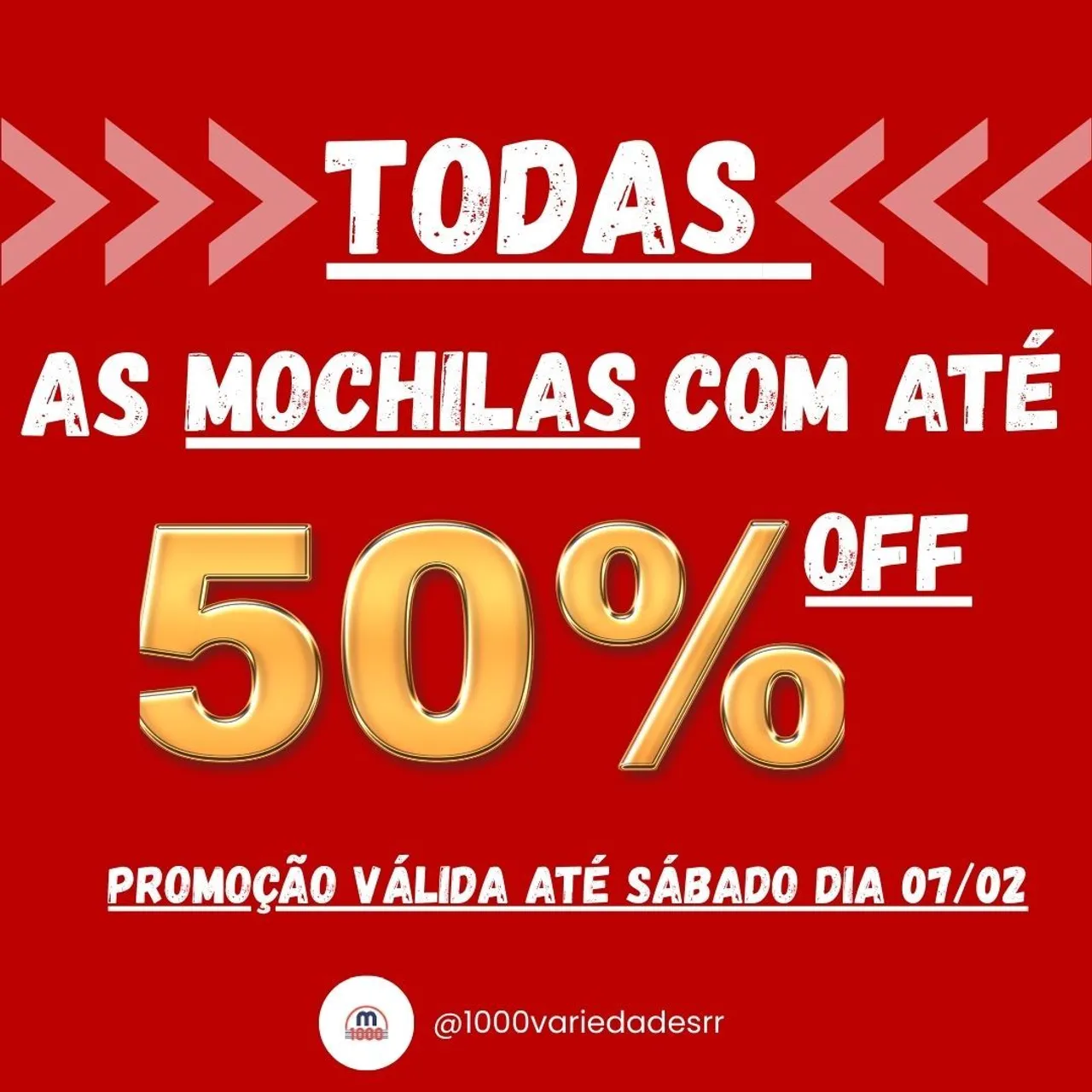 Aproveite a super promoção! Mochilas com 50% de desconto. Diversos modelos e cores para você escolher a que mais combina com você.