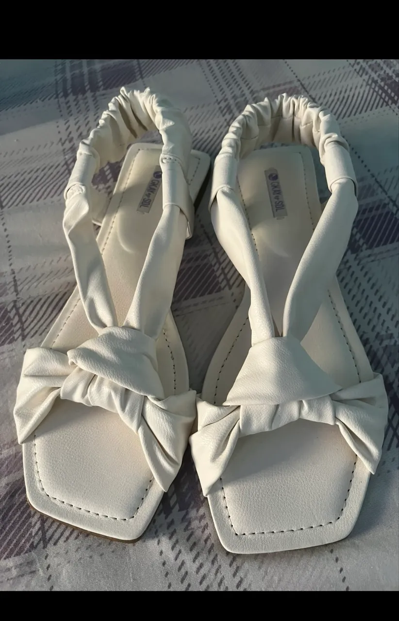 Charmosa sandália rasteira branca, perfeita para um visual leve e elegante. Conforto e estilo em cada detalhe, ideal para os seus dias de sol.