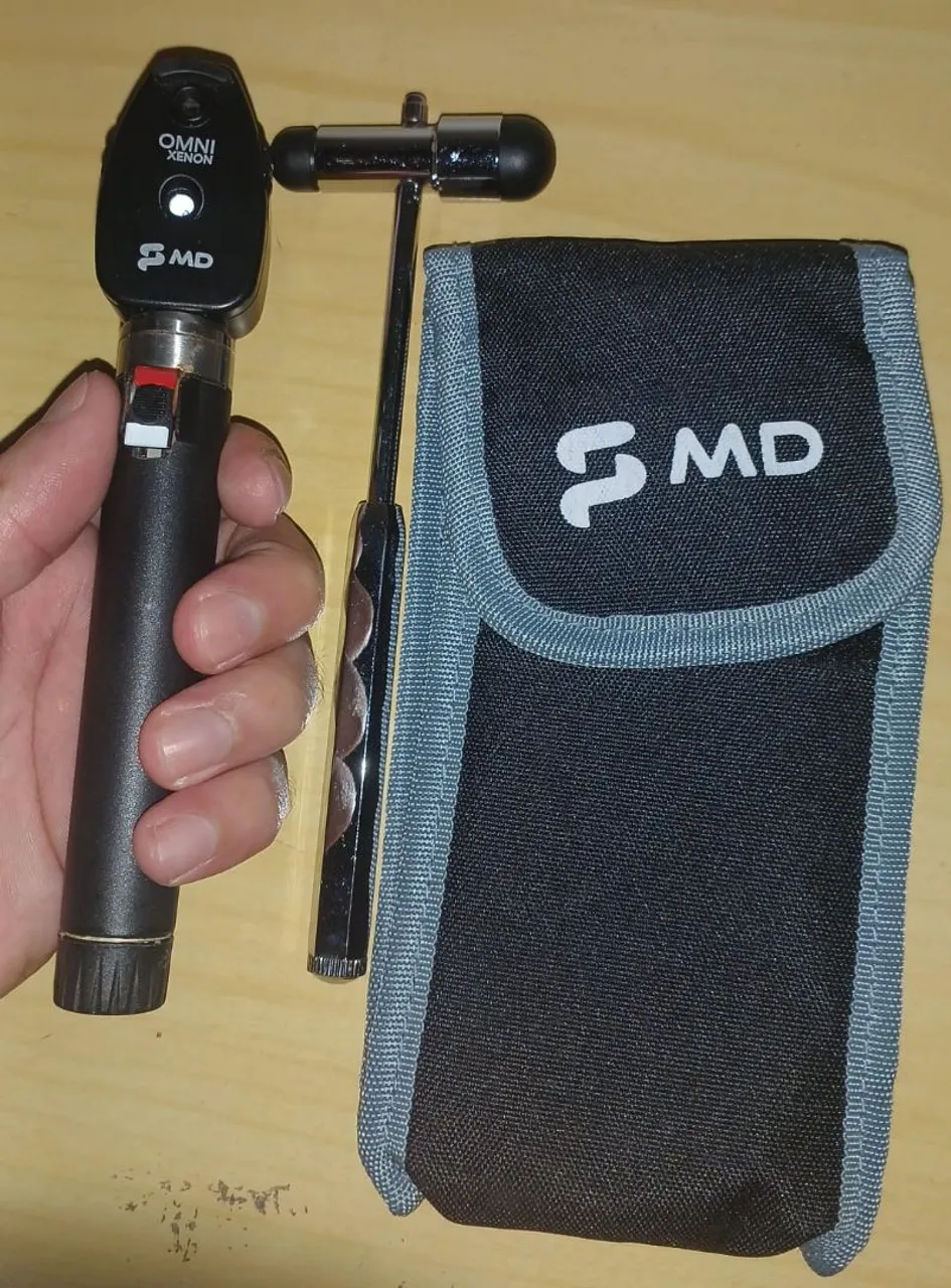 Oftalmoscópio em excelente estado, ideal para exames oftalmológicos precisos. Aparelho com design ergonômico e iluminação de alta qualidade para uma visualização clara e detalhada.