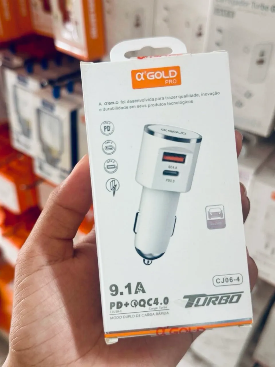 Carregador veicular com carregamento turbo 9.1A, PD + QC4.0 e modo duplo de carga rápida. Perfeito para manter seus dispositivos sempre carregados durante suas viagens. Marca Gold, qualidade e inovação.