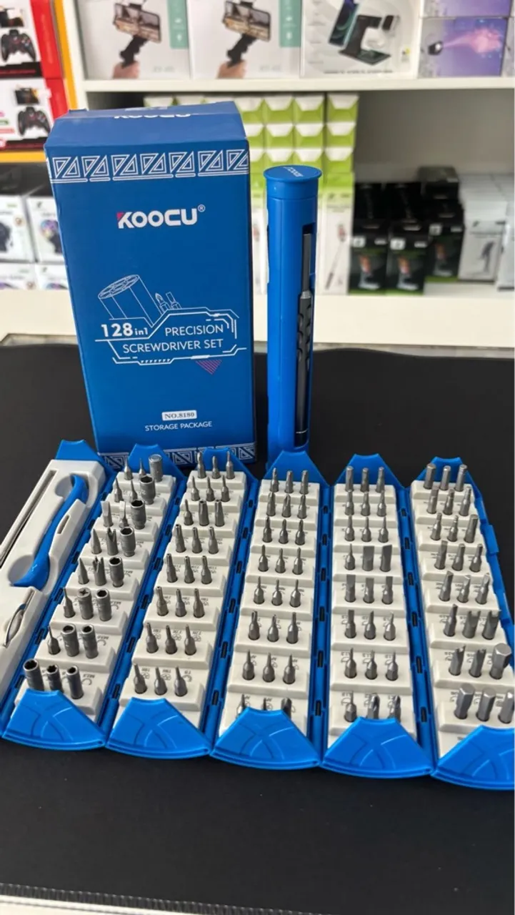 Kit de chaves de precisão com 128 bits diferentes para reparo de celulares e outros dispositivos eletrônicos. Ideal para técnicos e entusiastas de eletrônica.
