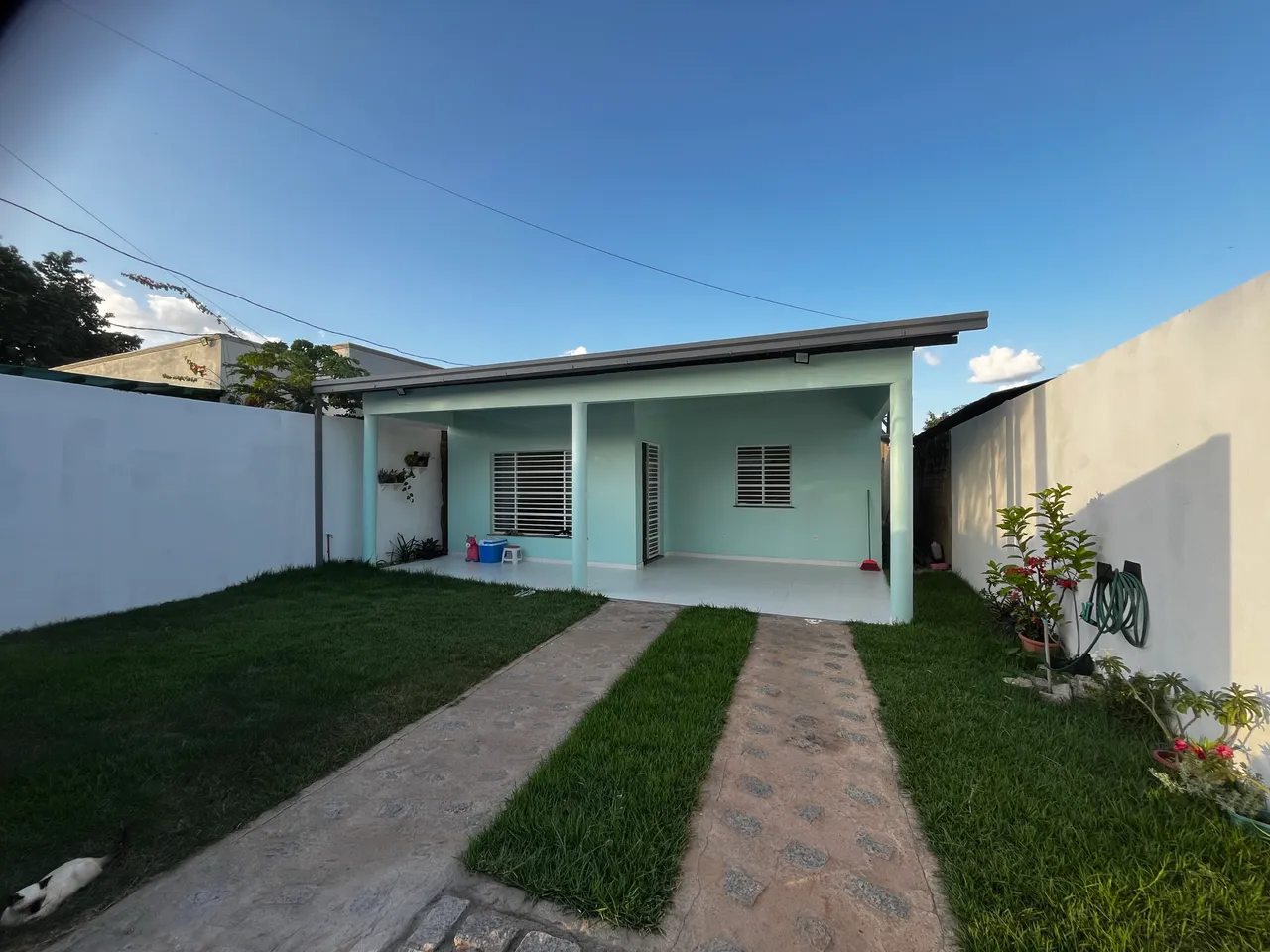 Casa com grama e jardim.