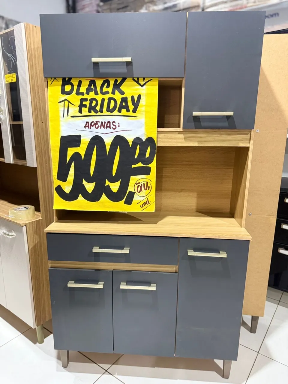Aproveite a Black Friday para renovar sua cozinha! Lindo armário com design moderno e cores que combinam com qualquer ambiente. Espaço amplo e funcional para organizar seus utensílios.