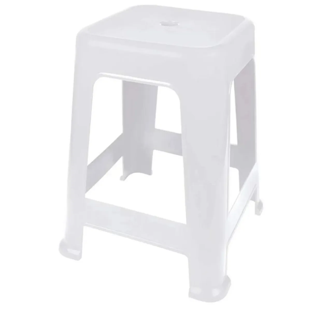 Conjunto com 4 banquinhos de plástico branco é perfeito para diversas utilidades. Resistente e durável, ideal para uso em casa ou em qualquer ambiente que necessite de um assento prático e versátil.