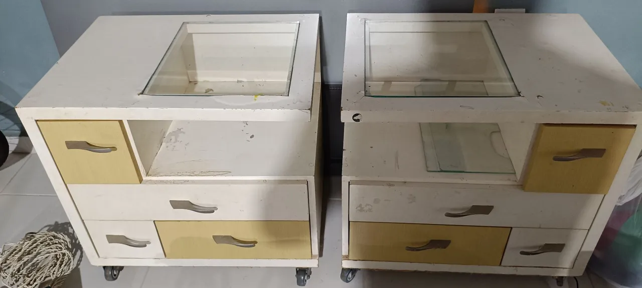 Vendo Par de cabeceira com gaveteiro e rodinhas funcionando perfeitamente, algumas avarias na pintura, mas gavetas abrindo normalmente e vidro sem trinco.