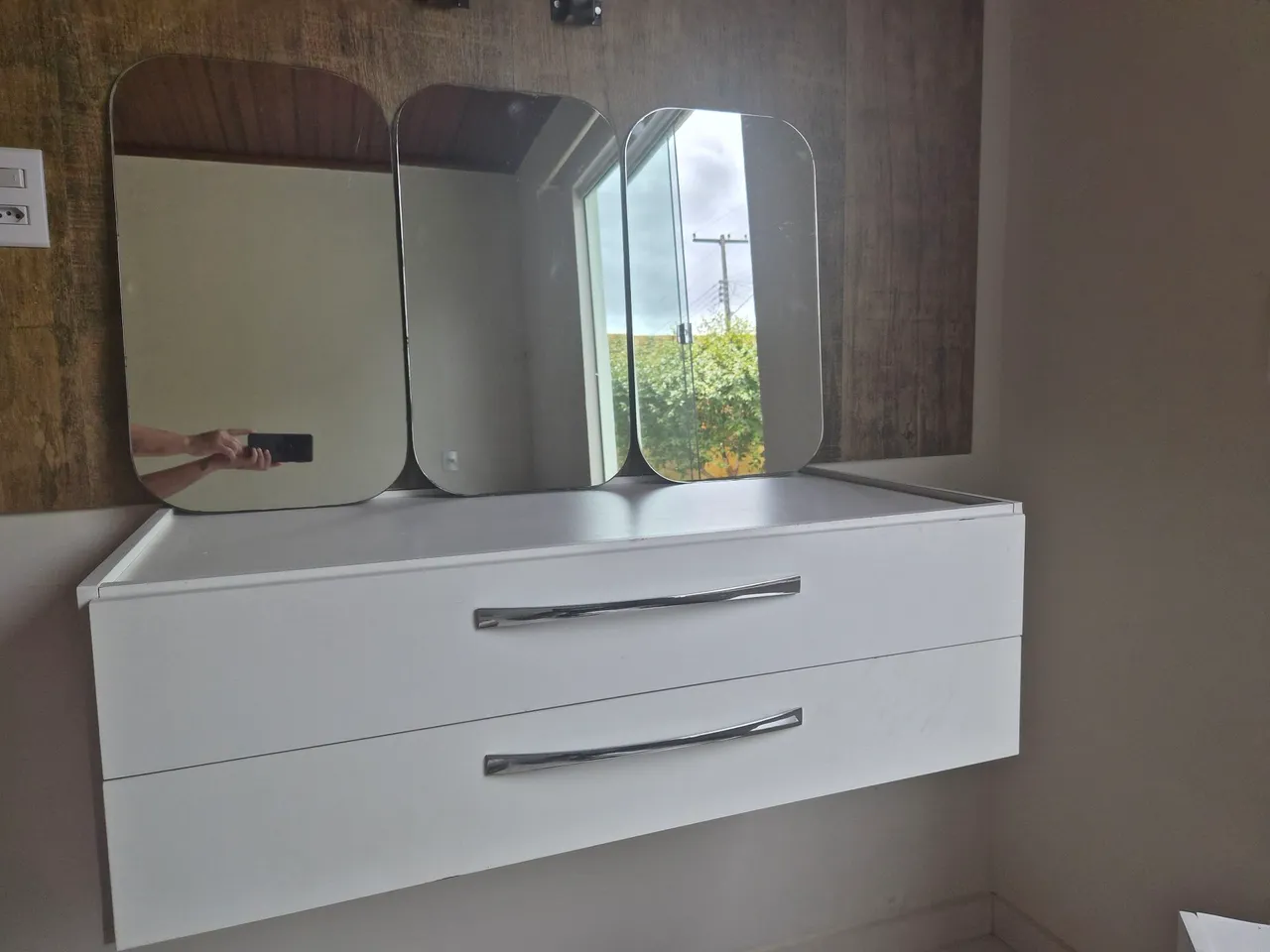 Linda cômoda de parede com três espelhos, perfeita para otimizar o espaço do seu quarto. Design moderno e funcional, ideal para quem busca praticidade e elegância. Aproveite!