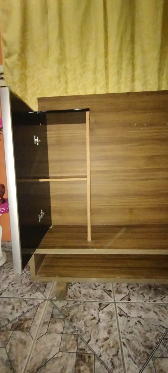 Rack de TV moderno e funcional com design elegante e acabamento amadeirado. Possui compartimentos para organizar seus aparelhos eletrônicos e objetos de decoração.