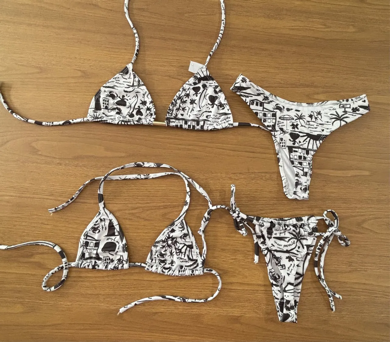 Conjunto de biquíni preto e branco, com estampa divertida, ideal para o verão. WhatsApp