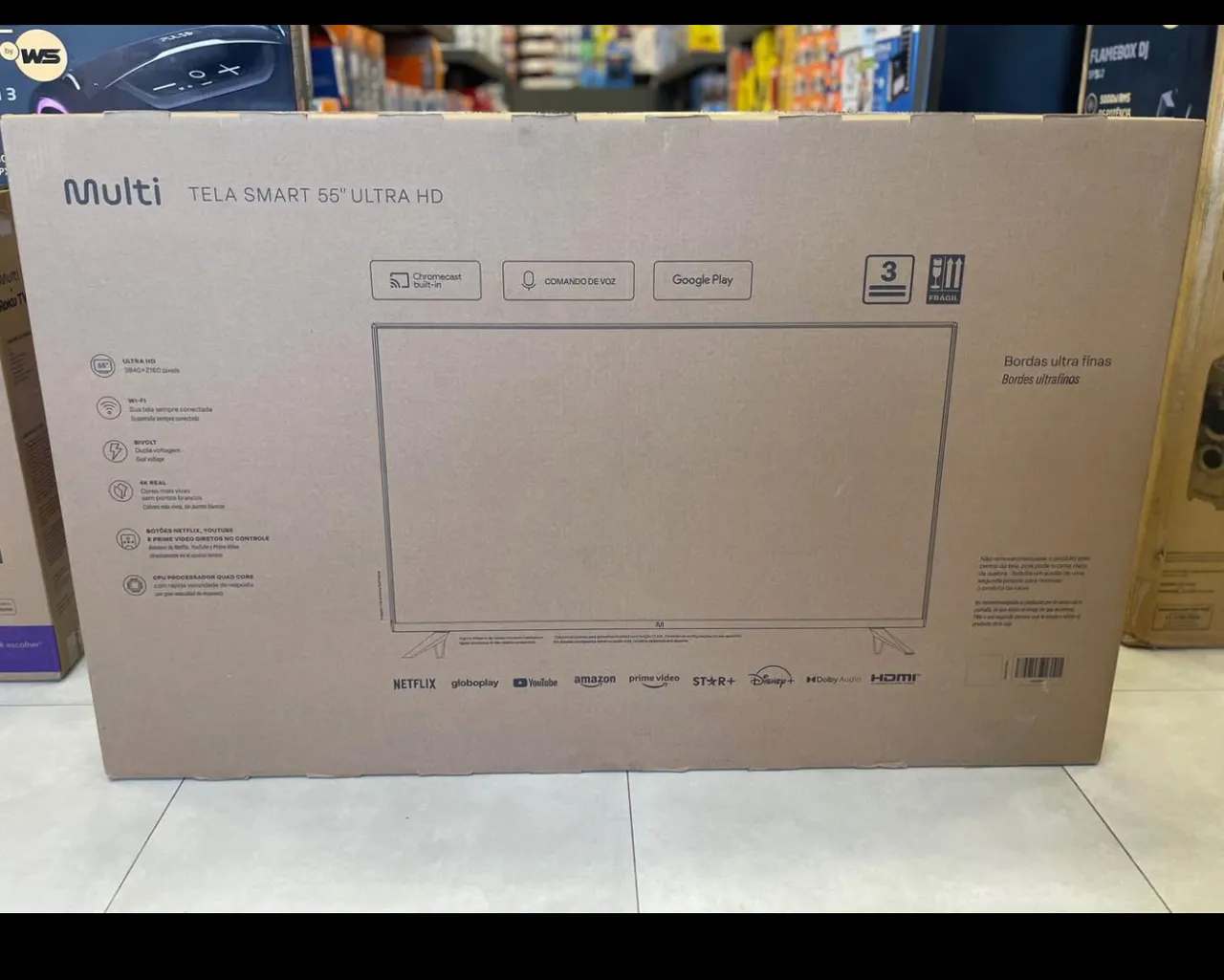 TV Smart 55 polegadas Multilaser com resolução Ultra HD, bordas finas, Chromecast built-in, comando de voz e Google Play. Ideal para quem busca uma experiência de entretenimento completa e de alta qualidade.