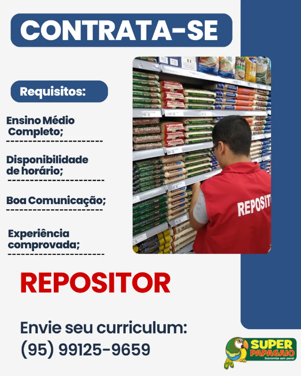 Contrata-se repositor com experiência. Envie seu curriculum para o número